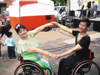 3年前梁春錦罹患乳癌,手術(shù)后以運動抗癌,她游泳、跳輪椅國標(biāo)舞及練瑜珈。蘇俊源為陪伴妻子,也一起練習(xí),兩人成為舞伴,也加入志工,經(jīng)常參加活動,夫妻倆坐著輪椅跳國標(biāo)舞,鼓勵了許多殘障者。