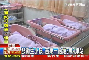 中新網(wǎng)4月29日電 據(jù)臺(tái)灣TVBS報(bào)道,為解決臺(tái)灣低生育率,島內(nèi)各縣市府均用獎(jiǎng)金吸引生小孩,例如新竹,生一胎就可以馬上領(lǐng)到3萬(wàn)元(新臺(tái)幣,下同)補(bǔ)助,苗栗縣府過(guò)去生育津貼是3000元,現(xiàn)在提高10倍,變成生一胎就能領(lǐng)到3.4萬(wàn)元,但得分成4年領(lǐng),苗栗縣現(xiàn)在人口數(shù)56萬(wàn),希望提出重賞后,新生兒人口數(shù)能夠增加10%,也就是1年從大約4950人,增加到5445人。