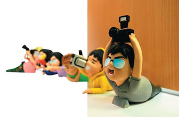 她設(shè)計(jì)6種不同的狗仔隊(duì)造型,包括攝影記者高舉雙手拿著相機(jī)、女記者拿著麥克風(fēng)往前擠、攝影記者扛著攝影機(jī)側(cè)身拍照等。陳郁青表示,通常門縫都有一點(diǎn)小空隙,加上狗仔隊(duì)門擋后,好像狗仔隊(duì)從門縫中爬出,她自己也覺得很有趣。