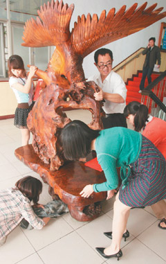 就在貓媽咪跳上窗臺(tái)時(shí),院檢人員們聽到躲在老鷹木雕座下方小貓咪瞇喵喵叫,望往窗臺(tái)上貓媽咪悲憐眼神,大伙決定展開救貓行動(dòng),只見檢察官、法官叔叔阿姨們,費(fèi)盡力氣搬起五噸重大木雕“救出來沒,趕快……”。