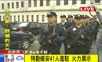 中新網(wǎng)6月2日電 據(jù)臺灣TVBS電視臺報道,臺中市接連發(fā)生重大刑案,維安特勤小組今日下午再次進駐臺中市,每名特勤隊員都配備了精良的武器裝備。不過警方表示,這次維安特勤人員進駐,穩(wěn)定力量將多過于實質破案的績效。