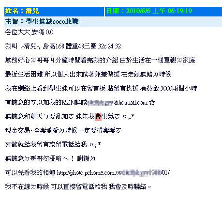 據(jù)報(bào)道,來到高雄縣教師會(huì)網(wǎng)頁(yè),點(diǎn)進(jìn)留言板流覽,為人師表的空間怎么會(huì)有一則“援交”廣告?廣告上頭不但自稱是大二學(xué)生,還“男女不限”,因?yàn)槿卞X,希望大家“援助”。
