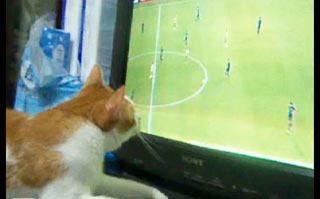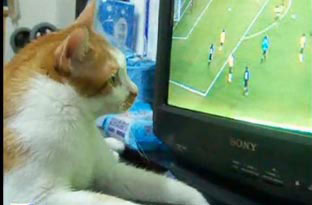 中新網(wǎng)6月22日電 據(jù)臺灣“今日新聞”報道,2010世界杯足球賽不僅是全球人們關(guān)注的焦點,連貓咪也喜歡,據(jù)了解,臺灣一只名叫加菲(GARFIELD)的貓咪,竟然緊貼在電視機前,無比專注地盯著轉(zhuǎn)播,還會激動地伸出貓爪,對著熒幕又拍又打。