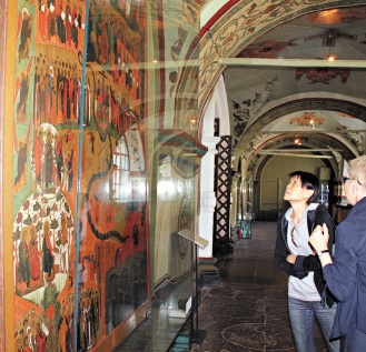 周美青在俄方人員陪同下參觀了修道院,并進(jìn)入院內(nèi)的一間教堂,她對(duì)教堂內(nèi)東正教的圣像畫(huà)特別感興趣,其中一幅壁畫(huà)“末世的審判”描繪東正教里人與天地的關(guān)系,以及天堂與地獄的對(duì)比,周美青在壁畫(huà)前駐足良久仔細(xì)欣賞,似乎對(duì)東正教信仰有所體會(huì)。