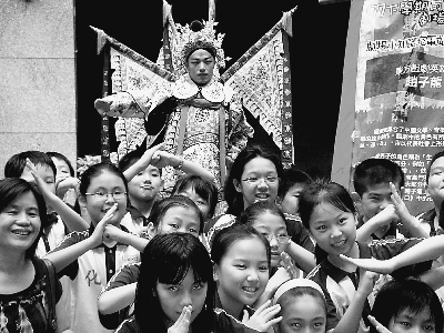 工作人員在旁講解:馬歇·馬叟是法國默劇大師;莎士比亞是英國文藝復興時期杰出的戲劇家和詩人;趙子龍是三國人物,這是趙子龍在京劇中的扮相,趙子龍是武生,扮相俊逸,身段威武穩(wěn)健……三個人物配合講解,擺出各種動作,小朋友們聽得津津有味。“砰!”“趙子龍”身邊的標示牌不知何故忽然倒下。一個小朋友立刻解釋:“趙子龍不愧是武生,用氣功就可以把牌子推倒!”此言一出,“趙子龍”都忍不住了,跟大家一起哈哈大笑。