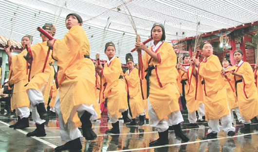 中新網(wǎng)9月28日電 據(jù)臺灣《聯(lián)合報(bào)》報(bào)道,南投縣各界紀(jì)念大成至圣先師孔子2559周年誕辰釋奠大典,27日上午在埔里鎮(zhèn)昭平宮育化堂孔廟舉行,特別的是,擔(dān)綱六佾舞“佾舞生”的育英小學(xué)首開縣內(nèi)先例,36名佾舞生中,小學(xué)六年級女生就占了19位。