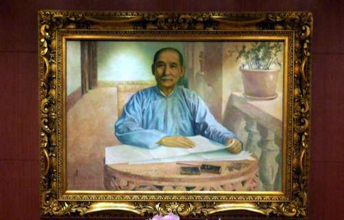 這幅孫中山畫像,出自旅法知名印象派大師朱德群之手。日前朱德群的兒子朱以峰特地從法國返臺,與隨行的法國畫商,前往國民黨中央,站在朱德群的孫中山畫像前拍照留影。
