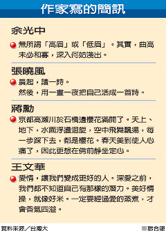 較少發(fā)短信的作家張曉風(fēng),昨天特別用短詩(shī)“用一晝一夜把自己活成一首詩(shī)”,示范短信該有的“簡(jiǎn)潔卻深刻”,王文華贊美張曉風(fēng),生活俯拾都是詩(shī),但多數(shù)人“把自己活成尸”,再次引來(lái)滿堂笑聲。