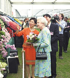 報(bào)道說,花展開幕前一天,伊麗莎白二世按慣例親往參觀,女王在四十五分鐘的停留時(shí)間內(nèi),花了五分鐘駐足臺灣攤位前,聽取臺“駐英代表”張小月解說臺灣蘭花之美。