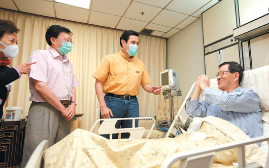 中新網5月25日電 據“中央社”報道,馬英九24日晚間偕同臺當局“行政院長”劉兆玄前往臺北榮民總醫(yī)院,探視進行肺部腫瘤切除手術的蕭萬長,馬英九希望蕭萬長安心靜養(yǎng),早日康復。