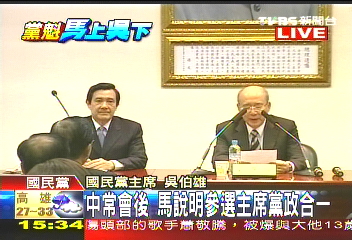馬英九曾于2005年首次當(dāng)選國(guó)民黨主席,2007年2月13日,因在臺(tái)北市長(zhǎng)任內(nèi)“特別費(fèi)”的使用,而被臺(tái)灣“高等法院檢察署”起訴(后經(jīng)臺(tái)灣法院宣判無罪),他曾承諾若遭起訴即辭去國(guó)民黨主席職務(wù),乃于同日請(qǐng)辭黨主席并正式宣布參選2008年“大選”。
