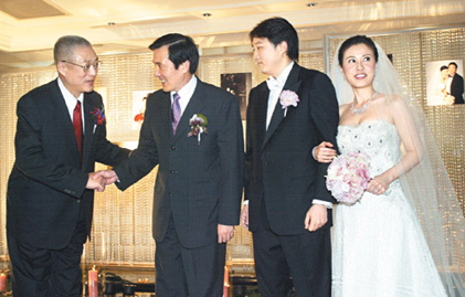 中新網(wǎng)6月15日電 據(jù)臺灣《聯(lián)合報》報道,國民黨秘書長吳敦義次子吳子文14日在臺北舉行結婚酒會與女方歸寧宴,馬英九、“行政院長”劉兆玄、“立法院長”王金平、國民黨主席吳伯雄等黨政高層出席致賀,現(xiàn)場冠蓋云集。