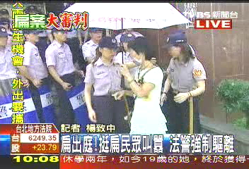 部分陳水扁支持者提出抗議,因?yàn)榕月牭拿~有限,支持者被擋在外面,不能進(jìn)去旁聽,因此不斷叫囂,高喊著“沒有天理”等話語,一度和法警發(fā)生推擠、爭(zhēng)吵,但隨即遭到法警強(qiáng)制驅(qū)離。