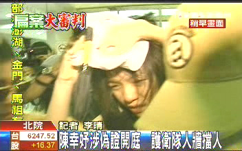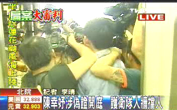 護(hù)衛(wèi)隊(duì)作風(fēng)強(qiáng)悍,組成人墻,用雨傘一路護(hù)著陳幸妤,不讓媒體拍到陳幸妤的表情,躲在雨傘下、戴著漁夫帽的陳幸妤,似乎被雨傘戳到臉,表情不悅,一度不耐、吼叫出聲,而開庭結(jié)束離開時,又再次爆發(fā)沖突,目前趙建銘正在接受偵訊當(dāng)中。
