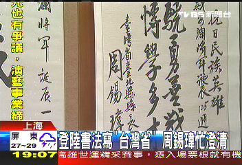 據(jù)臺媒報道,在上海的書畫展中,臺北縣長周錫瑋送去的書法,上面落款寫的是“臺灣省臺北縣長周錫瑋”,“臺灣省”三個字引發(fā)島內(nèi)討論。