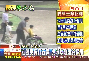 中新網(wǎng)7月16日電 據(jù)臺灣TVBS報(bào)道,陳水扁因右腳肌腱炎受傷而打上石膏,吳淑珍16日上午帶著女婿趙建銘,前往臺北看守所探視陳水扁。