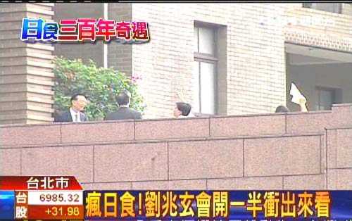 中新網(wǎng)7月22日電 據(jù)臺灣媒體報(bào)道,盡管臺灣只能看到日偏食,但民眾“追日”熱情高漲,政治人物也不例外。臺當(dāng)局“行政院長”劉兆玄與副手邱正雄等人今天上午在辦公室開會,剛到一半就沖到二樓陽臺看熱鬧。