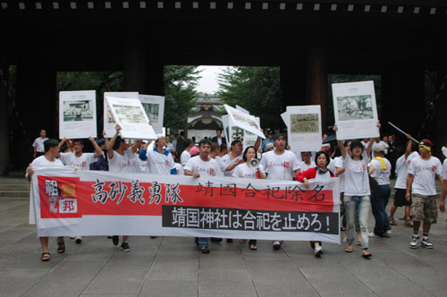“還我祖靈隊”接著在大廣場上高歌“安魂曲”、吊祭早年被強迫合祀于靖國神社的祖先。他們在廣場停留近30分鐘后列隊步出靖國神社正殿,搭車離開現(xiàn)場。