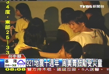 中新網(wǎng)9月8日電 據(jù)臺灣TVBS報道,臺灣921地震十周年,馬英九夫人周美青,7日下午以“周老師”的身份,陪當年的災童看紀錄片。