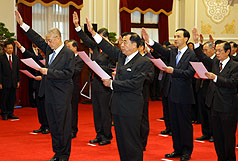 馬英九下午主持了“行政院院長”、“副院長”、“政務首長”暨“總統(tǒng)府”秘書長宣誓就職典禮,吳敦義與新任“總統(tǒng)府”秘書長廖了以站在最前排。蕭萬長、“立法院長”王金平、“司法院長”賴英照、“監(jiān)察院長”王建煊、“考試院長”關中及“國安會”秘書長蘇起觀禮。