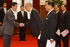 中新網(wǎng)9月10日電 據(jù)“中央社”報道,臺當局新任“行政院長”吳敦義今天下午率全體“閣員”在“總統(tǒng)府”宣誓就職,司儀逐個唱名名單,馬英九逐一對鞠躬“閣員”回禮。