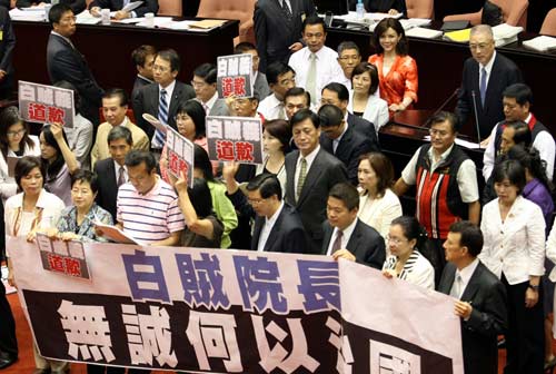 據(jù)臺灣媒體報道,吳敦義上午就來到“立法院”準備報告施政方針,但還沒上臺,事前保密到家的民進黨“立委”們,突然拿著白布條、標語霸占主席臺,大喊“白賊義,道歉”,稱吳敦義香港行的說法一變再變,有誠信問題。吳敦義則留在原位,國民黨人上前安撫,也做護駕動作,避免與民進黨“立委”發(fā)生肢體沖突。