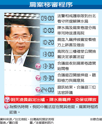 高院將由三位庭長、兩位法官組成的五人小組,于下午1點在三樓禮堂公開抽簽分案,從81位庭長、法官當(dāng)中抽出承審股別,扁案卷證就送合議庭辦公室;只要不是下午有庭期的合議庭,原則上會立即閱卷,開庭決定是否接押阿扁。