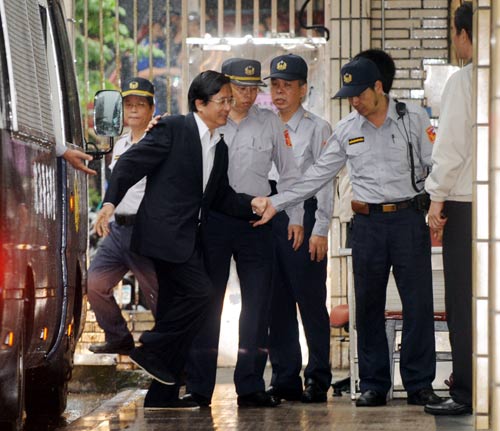 陳水扁在10月9日凌晨重回臺北看守所之后,今天是第一次二審準(zhǔn)備程序庭,由于臺北下著大雨,導(dǎo)致陳水扁到高院時有些遲到,約9點(diǎn)才抵達(dá)高院候?qū)徥。警備車?枯^接近候?qū)徥,原本法警?zhǔn)備雨傘,但陳水扁一個箭步就從車上跳下,直接走進(jìn)候?qū)徥,陳水扁面帶微笑,感覺精神不錯。