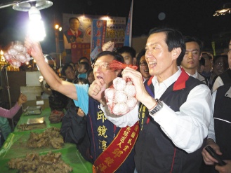 “新埔街上今晚最多人。”陪同掃街的新埔鎮(zhèn)長賴江海說,秋冬晚上八時(shí)以后街頭冷清,昨晚全站出來。馬英九接著到二重夜市,夜市里民眾爭(zhēng)相與他握手,他看到蒜攤還拿起蒜頭高喊“凍蒜!”