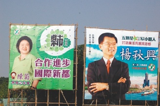 中新網(wǎng)1月18日電 綜合臺灣《聯(lián)合報》報道,大高雄市長選舉,民進黨“秋菊之爭”兩人比鄰豎立廣告牌,“合作進步,國際新都”與“五顆星南方小巨人”互別苗頭。