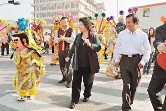 陳菊昨天上午參加高雄縣議員史萬忠的告別式,并接受湖內(nèi)鄉(xiāng)民邀請,在迎回湖內(nèi)鄉(xiāng)葉厝村清水寺供奉的辛府元帥時,在湖內(nèi)鄉(xiāng)太爺村、葉厝村交界,帶電音三太子,一起加入迎神遶境活動,并向往來的民眾揮手致意。