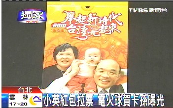 中新網(wǎng)2月1日電 據(jù)臺灣TVBS報道,春節(jié)腳步逼近,民眾喜歡紅包賀卡沾沾喜氣。綠營政治明星蘇貞昌特別準備招牌“電火球”卡片,寶貝小孫女照片第一次公開亮相;而民進黨主席蔡英文也有“圓滿”紅包,和各區(qū)“立委”參選人一起具名。