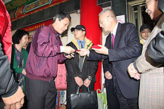 吳敦義在拈香祝禱期間,在大佛風景區(qū)內的大雄寶殿廣場旁親自種下菩提樹,并發(fā)放888個福袋給前來游玩的民眾。