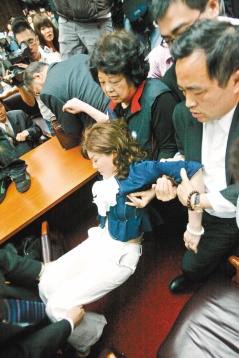 藍(lán)綠陣營接下來爆發(fā)四波激烈肢體沖突,多人掛彩,上午9時(shí)一到,會(huì)議主席趙麗云欲宣布開會(huì),當(dāng)場(chǎng)爆發(fā)激烈拉扯、相互動(dòng)手,吳清基在爭(zhēng)吵中完成簡(jiǎn)短報(bào)告,國民黨團(tuán)提案進(jìn)入大體詢答,此時(shí)又發(fā)生圍著趙麗云的第二波激烈沖突。
