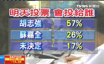 報(bào)道稱,誰才是大臺中市民心中理想的第一屆市長?TVBS民調(diào)中心,在5月25日晚間做出的最新民調(diào)顯示,假如明天就是投票日,將有57%的大臺中市民投票給國民黨籍的胡志強(qiáng),26%投給民進(jìn)黨籍的蘇嘉全,差距有31個百分點(diǎn),尚未決定的比例則有17%。