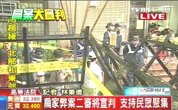 中新網(wǎng)6月11日電 據(jù)臺(tái)灣TVBS報(bào)道,陳水扁家族涉及的公務(wù)機(jī)要費(fèi)、南港展覽館、龍?zhí)顿彽丶跋村X案等案,臺(tái)灣高等法院于11日上午二審宣判;高等法院場(chǎng)外聚集了一堆挺扁、反扁民眾等候判決結(jié)果,警方派出大批警力,進(jìn)行周邊出入管制,嚴(yán)防沖突發(fā)生。