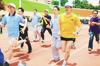 據(jù)悉,中國(guó)國(guó)民黨青工總會(huì)20日在高雄縣立體育場(chǎng)舉行運(yùn)動(dòng)嘉年華會(huì),馬英九以黨主席身份與會(huì),喜愛(ài)運(yùn)動(dòng)的他表示,養(yǎng)成運(yùn)動(dòng)習(xí)慣只須克服一個(gè)“懶”字。接著,馬英九帶頭跑運(yùn)動(dòng)場(chǎng)一周400米,為鼓勵(lì)大家快跑,只要在兩分鐘內(nèi)跑完400米,就有2000元獎(jiǎng)金。