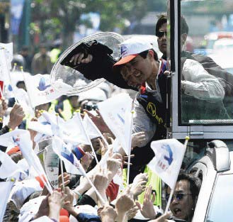 馬英九搭乘總部安排的新款防彈車掃街,由于近來刺馬傳言不斷,他上車時特別用手敲打檢測防彈玻璃。(圖:臺灣《聯(lián)合報》)