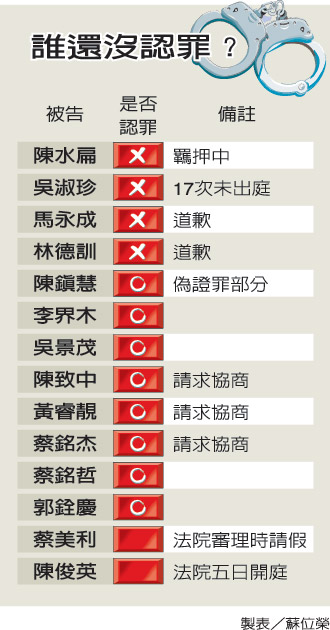 中新網(wǎng)2月5日電 據(jù)臺灣媒體報(bào)道,臺北地方法院繼續(xù)開庭審理陳水扁家族四大案,今天上午陸續(xù)傳訊前力麒建設(shè)董事長郭銓慶與吳淑珍的嫂嫂、被告陳俊英,兩人庭上均認(rèn)罪。至此,扁案被告中已有九人認(rèn)罪。