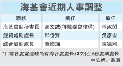 去年底,海基會(huì)人事地震,包括綜合處、經(jīng)貿(mào)處、文化處在內(nèi)等“一正處長(zhǎng)、二副處長(zhǎng)”都未獲續(xù)任。近期被視為是;鶗(huì)最后一位前朝人馬的林淑閔,日前離職,遺缺由高文誠(chéng)遞補(bǔ),這項(xiàng)新人事也待“陸委會(huì)”核備。