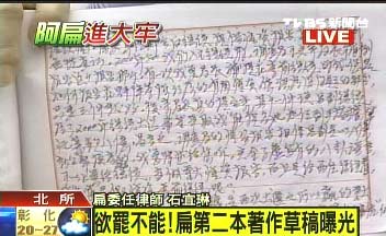中新網(wǎng)2月18日電 據(jù)臺(tái)灣TVBS報(bào)道,出了第一本新書《臺(tái)灣十字架》后,有了暢銷作家的頭銜,陳水扁欲罷不能,在看守所里持續(xù)寫書,今天第二本書的著作手稿曝光。