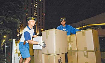記者昨晚9時許根據(jù)爆料前往寶徠,發(fā)現(xiàn)一輛標明“康潔搬家公司”的17噸大貨車?烤鄬殢100米處,旁邊還有一輛1.75噸小貨車,約有6名搬家工人將一箱箱貨品搬上車,分析應(yīng)是陳致中搬家。