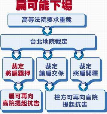 陳水扁去年底被起訴、無(wú)保釋放后,立即提起抗告,臺(tái)灣高等法院于十二月十七日認(rèn)為,扁可能在審判中影響證人造成案件審理困難,駁回抗告;十二月二十八日,法院認(rèn)定扁的犯罪嫌疑重大,且扁家在海外有十幾億元資產(chǎn),隨扈又無(wú)法確實(shí)監(jiān)管其行蹤,有逃亡、勾串、滅證等羈押理由;今年一月七日時(shí),仍認(rèn)同檢方意見(jiàn),同意押扁。