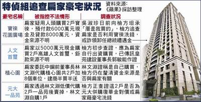 特偵組為追查扁家是否利用購(gòu)買(mǎi)豪宅洗錢(qián),除調(diào)查寶徠及脫手的一品苑外,還鎖定追查扁家的高雄人文首璽2戶豪宅,以及扁家是否委任“中鋼”前董事長(zhǎng)林文淵低價(jià)代購(gòu)北市“植心園”2戶豪宅。
