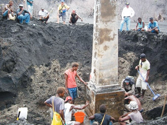由于碑體幾乎被火山灰覆蓋,項目小組遂請當?shù)貎S民協(xié)助開挖,原先因干熱土質(zhì)極硬,小組原擔心挖掘會不順,但開挖前晚又下大雨,土質(zhì)變軟,第二天又變成涼爽陰天,挖掘相當順利,很快就讓整個紀念碑完整露出,上刻“中國廣東民眾死亡紀念碑”。