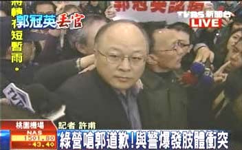 出關(guān)后,臉部表情略顯蒼白、鐵青的郭冠英,面對(duì)現(xiàn)場(chǎng)兩派人馬包圍、抗議的聲浪,并未再度發(fā)表談話(huà),并在黑衣人簇?fù)硐,搭上座?chē)離開(kāi)機(jī)場(chǎng)。