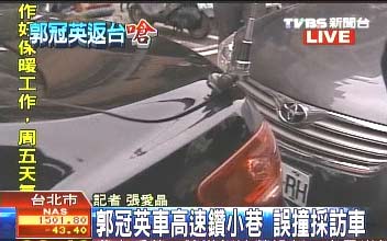 之后,郭冠英座車(chē)抵達(dá)臺(tái)北市區(qū),在媒體車(chē)輛的跟拍下,發(fā)現(xiàn)郭冠英的座車(chē)在臺(tái)北市大小街頭繞來(lái)繞去,并未前往“新聞局”也未返家,似乎想要把記者跟車(chē)甩掉。郭冠英座車(chē)甚至一度和緊跟的媒體采訪(fǎng)車(chē)在臺(tái)北醫(yī)學(xué)院附近發(fā)生輕微擦撞,由于人車(chē)并無(wú)大礙,郭冠英車(chē)輛隨即再度駛離,并繼續(xù)在臺(tái)北街頭亂逛。