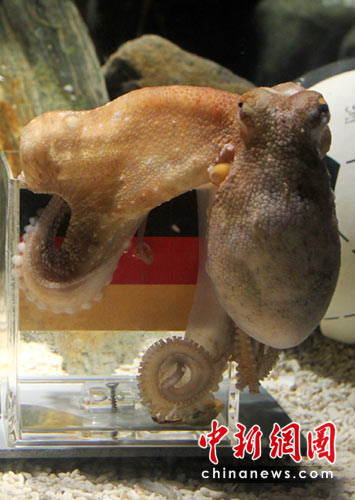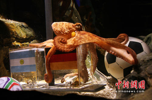 據(jù)悉,海洋館員把分別印有德、阿旗幟的貝殼放入玻璃缸,與對英格蘭隊比賽前脆快取出德國那枚貝殼不同,章魚“保羅”對德國和阿根廷的對決有些“猶豫不決”,“考慮了長達一小時”但是最終還是取出了印有德國旗幟玻璃缸里的貝殼。