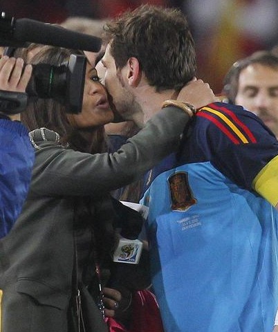 比賽結(jié)束后,身為體育主播的卡西美艷女友自然要采訪西班牙的功臣,訪談結(jié)束后,她在眾目睽睽之下現(xiàn)場(chǎng)為圣卡西送上香吻。