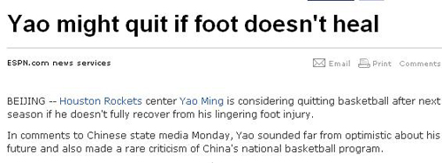 中新網(wǎng)7月28日電 據(jù)EPSN報道,姚明近日在北京參加慈善晚宴時,在接受網(wǎng)友提問中親口證實將在今年季前賽復(fù)出,但他同時講出驚人之語:一旦出現(xiàn)腳傷反復(fù)的最壞情況,不排除下個賽季就退役。